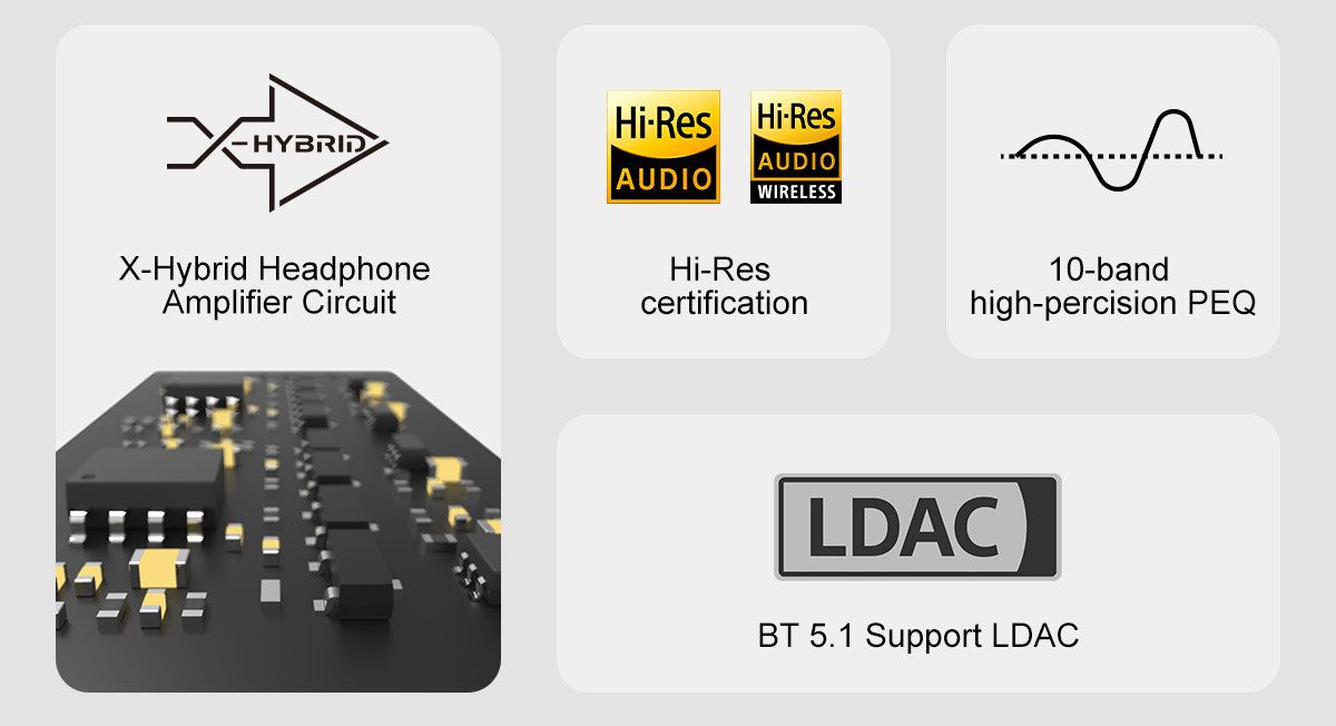 Zesilovací část Topping DX5 II posouvá ikonickou NFCA architekturu na novou úroveň díky technologii X-Hybrid. Jedná se o třístupňový proces, kombinující vysoký výkon s nízkou spotřebou energie a minimálním generováním tepla. Navzdory kompaktnímu provedení tak DX5 poprvé nabízí symetrické čtyřkanálové zesílení, které dokáže dodat až 2x 6400 mW výkonu do zátěže 32 Ω. Zesilovač si tak poradí s náročnými sluchátky, ale dokonale tiché pozadí zajistí i pro citlivé víceměničové InEar monitory s nízkou impedancí.