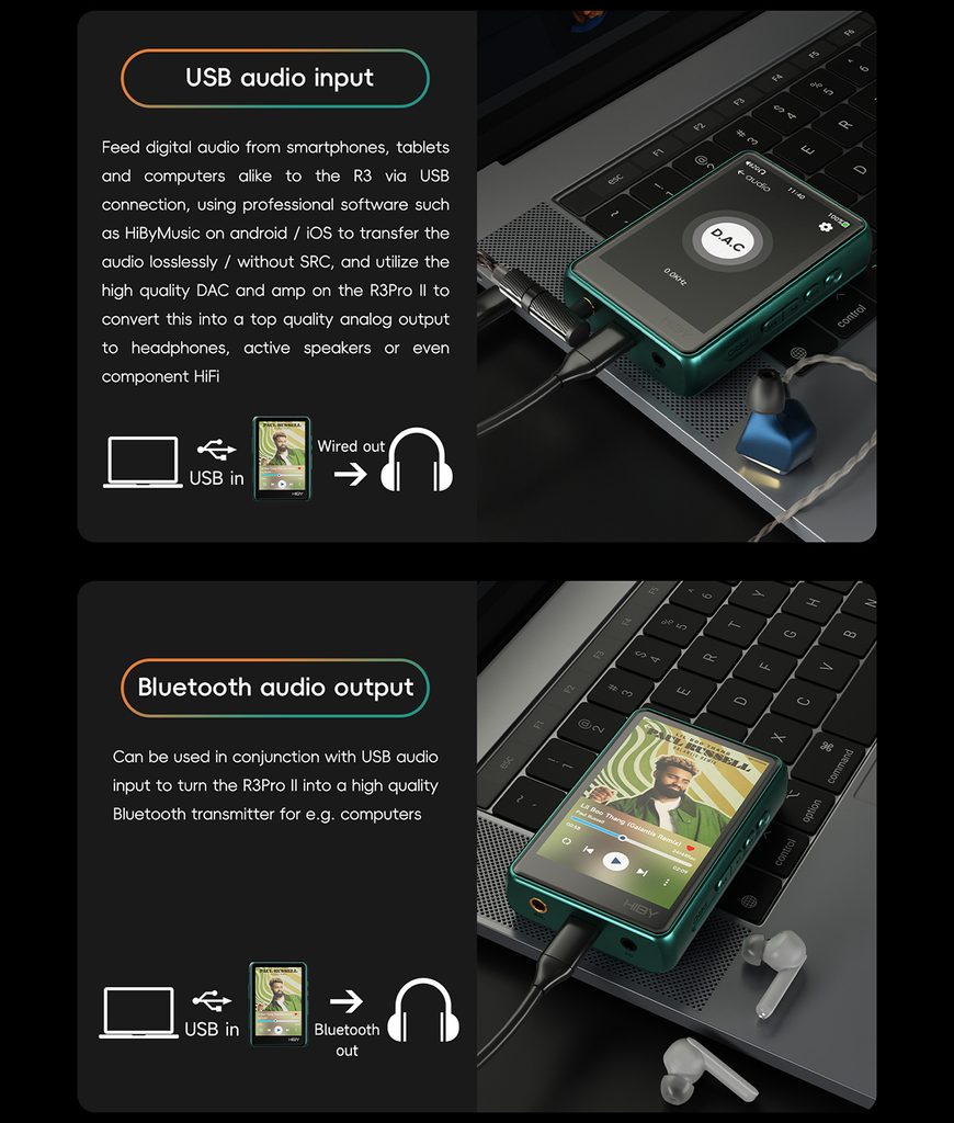 Přehrávač R3 PRO II může sloužit nejen jako kvalitní HiRes přehrávač, ale také jako USB a Bluetooth přijímač, který snadno připojíte k telefonu či notebooku přes Bluetooth nebo USB-C kabel. Připojením přes USB získáte vyšší kvalitu zvuku, než jakou nabízí samotný telefon, ze kterého si R3 PRo II bere jen čistá data.