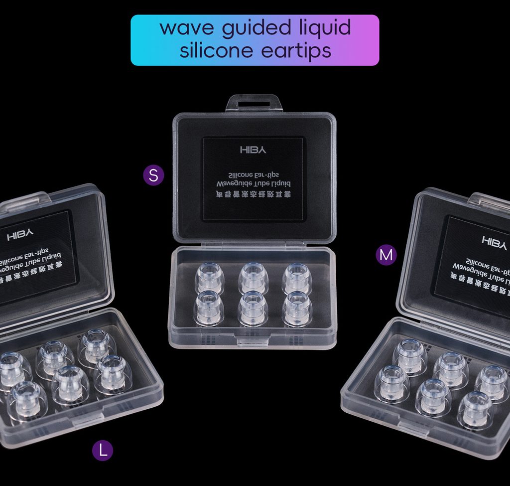 Silikonové nástavce HiBy WG02 jsou dostupné v sadách různých velikostí, aby se zajistilo perfektní utěsnění pro většinu uživatelů. Nástavce jsou nabízeny ve variantách SSS, MMM a LLL (malé, střední a velké v různých sadách) pro optimální usazení. K dispozici je také mixované balení SML pro ty, kteří si chtějí otestovat, která velikost jim nejvíce vyhovuje.