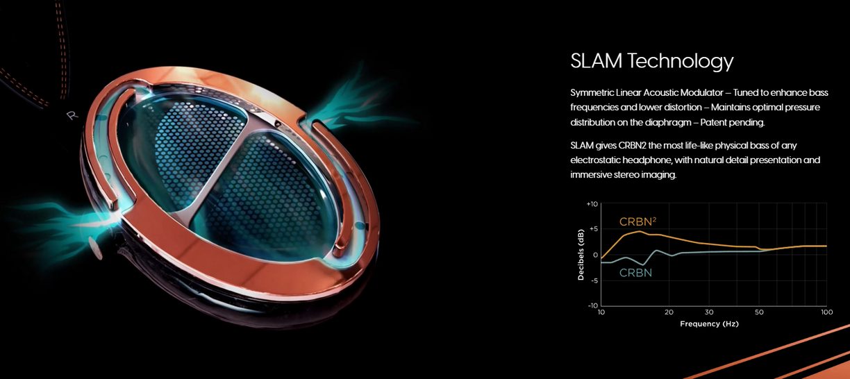 Největší inovací modelu CRBN2 je patentovaný systém SLAM. Tento akustický modulátor byl navržen tak, aby optimalizoval distribuci tlaku na membránu a posílil nízké frekvence bez nárůstu zkreslení. Díky SLAM dosahují sluchátka CRBN2 nejvíce realistického a hmatatelného basu, jaký byl kdy u elektrostatických sluchátek zaznamenán. Hudba tak získává na tělesnosti a dynamice, aniž by byla obětována jemnost detailů nebo pohlcující stereo obraz.